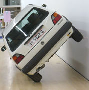 Hr. M.: Das ist eigentlich ein Geheimnis, aber ich sag es euch trotzdem. Also bei der Gurke ist es eigentlich gar kein Geheimnis, da gibt es einfach unter der Gurke einen Stahlstift, und dann bohrt man ein Loch und steckt diesen Stift in das Loch hinein. Bei dem Auto ist es so, dass Herr Wurm das gar nicht befestigt, denn Künstler sind auch, wenn sie berühmt werden, total beschäftig und können nicht mehr so viel selber machen. Dann kommen sie an und sagen zu uns: „Macht mal das Auto fest!“ Aber das Auto würde, so wie es steht, nur mit dem Stift dazwischen, tatsächlich halten, nur da das hier ein Museum ist, wo ganz viele Leute und auch Kinder reinkommen, muss man das irgendwie sicherer machen. Deshalb ist durch den Stift eine Stange durchgesteckt, die einmal in der Wand befestigt ist, dann durch den Reifen durch-geht und an dem Metallteil des Rades festgemacht ist, so dass es nicht umfallen kann.