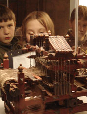 Sie zeigt uns ein ganz altes Webstuhlmodell.