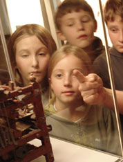 Fr. D: Restauratoren kümmern sich um Kunstwerke. Sie schauen, ob die Kunstwerke noch in Ordnung sind und ob z.B. die Luftfeuchtigkeit stimmt. Bei diesem Webstuhlmodell hier musste erst alles aufgetrennt und gesäubert werden, das dauerte in etwa 10 Tage, weil es alles erst ganz fein gemacht werden musste, weil alle Fäden auch ganz morsch waren und weil alles ja schon ganze 200 Jahre alt ist. So sah der Webstuhl vorher aus. Alles war durcheinander.