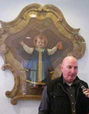 Herr Dering vor dem Wappen des 'Münchner Kindls' am Eingang zur Ausstellung 'Typisch München'.