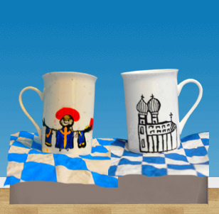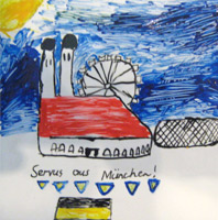 Im Münchner Stadtmuseum haben die Kunstdetektive die Ausstellung 'Typisch München' erforscht. Im Kunstatelier haben sie 'München Souvenirs' erfunden. München-Tassen, Büsten berühmter Münchner, Plakate, Collagen, München-Kacheln und ein Modell der Frauenkriche sind entstanden.