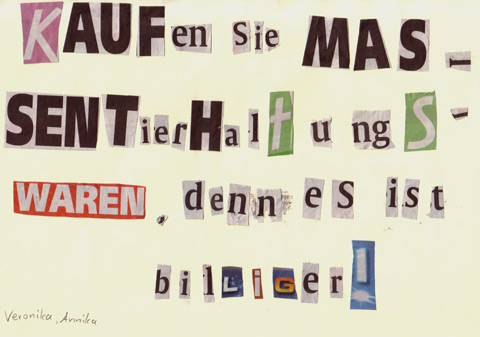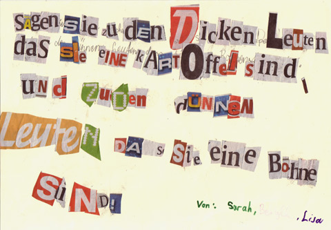 Erwin Wurm zeigt in seiner Ausstellung in einer Zeitung 'Schimpfplakate'. Hier gibt er Anweisungen, Sachen zu machen, die man eigentlich gerade nicht machen soll. Wenn man das dann liest, fängt an darüber nachzudenken, was man tun sollte und was nicht. Wir haben eigene Plakate gestaltet. Würdest du tun, was da drauf steht?