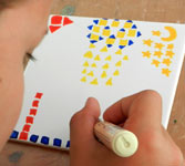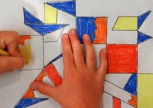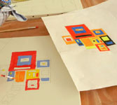 Nach der 'Schatzsuche' durch die Ausstellung entwarfen die Kinder mit Lineal, Bleistift, Buntstiften und Tonpapieren in den De Stijl Farben ihre eigenen 'Neue Kunst Bilder' vor den Originalen in der Ausstellung.