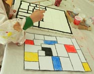 Piet Mondrian und seine Künstlerfreunde der Gruppe ‚De-Stijl‘ schufen ganz neuartige Bilder aus wenigen Farben, aus Linien und Flächen. Was steckt dahinter? Auch alltägliche Dinge, wie Kleider, Möbel, ganze Inneneinrichtungen und sogar Häuser haben sie so neu erfunden. Auf der Spurensuche in der Ausstellung kamen die Kinder an Hand von vielen Hinweisen und Forscheraufgaben den Ideen der Küpnstlergruppe auf die Spur.