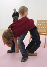 Die Kinder zeichnen 'Anweisung' und erfinden eigene ‚Blitzskulpturen’ auf dem rosa Podest in der Ausstellung.